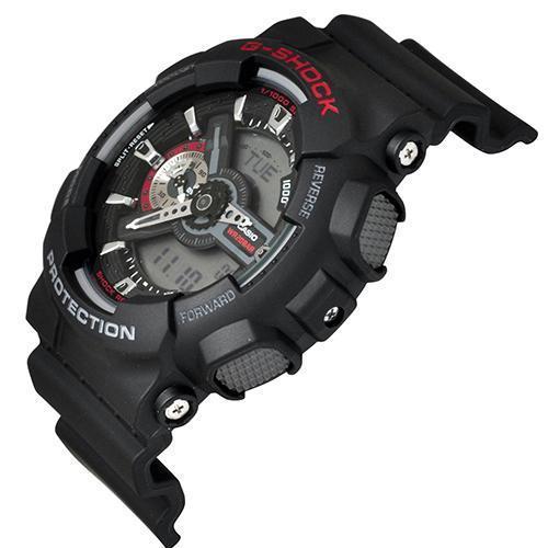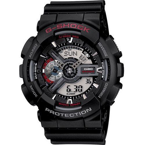 Other specs of the Casio G-Shock Watch GA-110-1ADR are: world time (29 time zones, 48 cities), amber LED, Resin band/case, mineral glass dial, shock-resistant construction, 15 seconds deviation per month, 12/24h time format, auto calendar up to 2099, multi-function alarms, stopwatch, 2 years CR1220 battery and 72g weight.