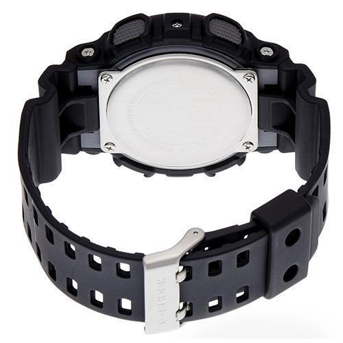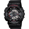 Casio G-Shock GA-110-1ADR is a stylish Analog Digital Watch from popular Japanese watch maker Casio. This model comes with a sporty black case and band along with a black coloured internal round dial. The G-Shock series watch is designed for a distinct fashion statement. It offers 200 meters water resistance and is perfect for sea/beach and swimming activities. It has white and grey coloured time markings with similar coloured time hands and has mini dials for digital date readings.